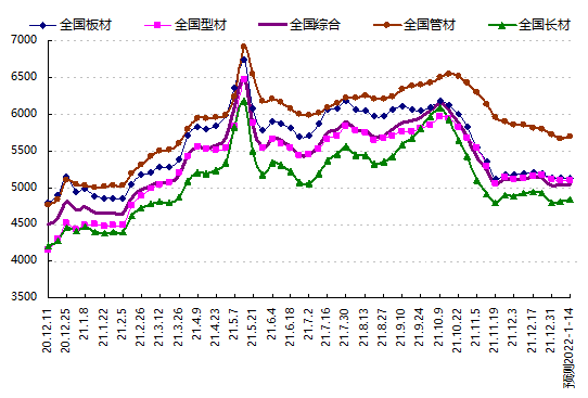 下周(2022.1.10-1.14)國(guó)內(nèi)鋼材市場(chǎng)價(jià)格將震蕩趨強(qiáng),長(zhǎng)材市場(chǎng)價(jià)格將小幅上漲,型材市場(chǎng)價(jià)格將穩(wěn)中趨弱,板材市場(chǎng)價(jià)格穩(wěn)中下滑,管材市場(chǎng)價(jià)格將穩(wěn)中上漲。全國(guó)絕對(duì)價(jià)格指數(shù)預(yù)計(jì)在5043元,上漲5元;其中,長(zhǎng)材絕對(duì)價(jià)格指數(shù)預(yù)計(jì)在4837元,上漲30元;型材絕對(duì)價(jià)格指數(shù)預(yù)計(jì)在5105元,下跌3元;板材絕對(duì)價(jià)格指數(shù)預(yù)計(jì)在5128元,下跌9元;管材絕對(duì)價(jià)格指數(shù)預(yù)計(jì)在5686元,上漲27元。
