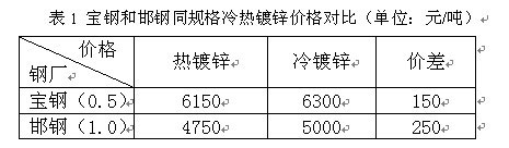 此外,從價(jià)格上來(lái)看,熱鍍鋅要比冷鍍鋅便宜,同種規(guī)格相同鋅層的冷鍍鋅比熱鍍鋅更貴,在價(jià)格上冷鍍鋅處于相對(duì)的劣勢(shì)。從表1中列出的寶鋼和邯鋼同規(guī)格冷熱鍍鋅價(jià)格中我們也能看出端倪。