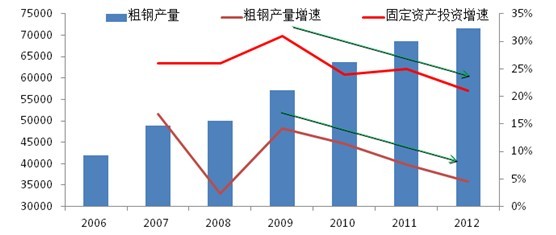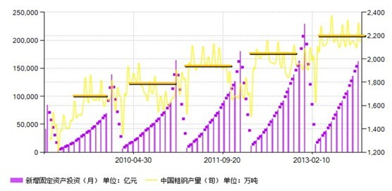 如果把粗鋼產(chǎn)量數(shù)據(jù)與固定資產(chǎn)投資數(shù)據(jù)放在一起做對比,并不難發(fā)現(xiàn),近幾年來,國內(nèi)粗鋼產(chǎn)量增速遠低于固定資產(chǎn)投資增速,同時2009年來,伴隨固定資產(chǎn)投資增速下降,國內(nèi)粗鋼產(chǎn)量增速也是下降的,兩者趨勢一致。而且,如果從絕對量來看,近年來國內(nèi)粗鋼產(chǎn)量水平與投資額水平大致保持平衡。如下圖所示。