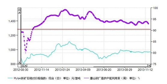 圖九、礦價與唐山高爐產(chǎn)能利用率對比