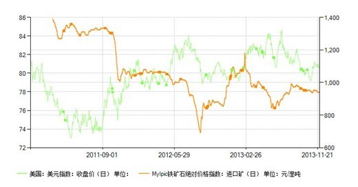 如果把礦價走勢跟一些主要經(jīng)濟金融指標(biāo)做下對比分析,不難發(fā)現(xiàn)在眾多的指標(biāo)當(dāng)中,美元指數(shù)跟礦價的相關(guān)性是最高的。如下圖所示。