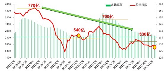 如果認為以上都只是粗線條的分析,那么可以再看一個更簡單的事實:雖然2013日均粗鋼穩(wěn)定在210萬噸以上,但我們并沒有看到社會出現(xiàn)庫存堆積的現(xiàn)象,如下圖所示。因此可以講,現(xiàn)實的供需水平基本上保持著一個平衡的態(tài)勢。