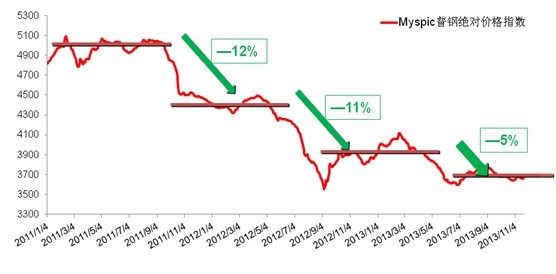 從2011年開始,國內(nèi)鋼材價格開啟了持續(xù)地下跌的通道。如下圖所示,從5000點到當(dāng)前的3600點,下跌了差不多三分之一,導(dǎo)致行業(yè)資產(chǎn)負債表急劇惡化,大量企業(yè)資不抵債,關(guān)門、跑路、破產(chǎn)……諸如此類的壞消息時有流傳于坊間。那么,到底是什么導(dǎo)致了鋼材價格的持續(xù)下跌?是因為需求差么?還是因為供應(yīng)太多?或者存在其他更為根本的原因?