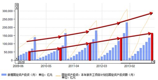 如果這個圖還不夠清晰和精確,那來看看下面這組數(shù)據(jù)。按照前10個月20%的增速來測算今年全年的固定資產(chǎn)投資總額,應(yīng)該接近44萬億,與2012年相比年度將增加7.4萬億,而2012年的年度增加額還不到6.3萬億,也就是說今年的增加額比去年的增加額多了1.1萬億,這是什么概念?08年金融危機領(lǐng)導(dǎo)搞的刺激也就4萬億的額度嘛。