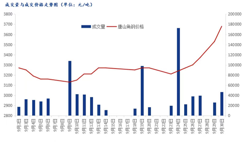 圖2:唐山型鋼成交量與角鋼價格走勢圖(單位:元/噸)唐山型鋼成交日度數(shù)量來看,成交集中在低價階段,隨著價格拉漲,成交量呈現(xiàn)縮量,當(dāng)然考慮市場上漲情緒熱烈,部分市場以及貿(mào)易商封庫惜售,總體而言,價格與成交量的絕對差值在曲線上呈現(xiàn)拉大趨勢;從調(diào)研來看,市場鎖價資源較多,鋼廠庫存去庫要大于社會庫存去庫,鋼企資源呈現(xiàn)供小于求的狀態(tài),部分鋼企現(xiàn)貨清空后甚至兜售遠(yuǎn)期排產(chǎn)資源,反觀貿(mào)易商除了前期清低價庫存以外就是鎖貨惜售,因此預(yù)計9月底至國慶假期,型鋼廠庫與社庫出現(xiàn)明顯分化,社庫將會呈現(xiàn)累庫,而廠庫整體進(jìn)一步去化。這對于市場更為關(guān)心的國慶假期后價格漲跌帶來不確定因素。