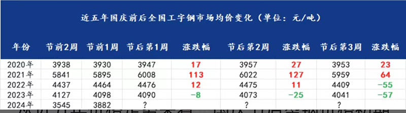 表1:2020-2024年全國工字鋼均價國慶前后變化(單位:元/噸)
