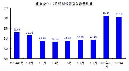 我們通過對重點(diǎn)鋼鐵企業(yè)的營銷渠道進(jìn)行分析后,卻發(fā)現(xiàn)并未如上文所述的情況,實(shí)際上2012年以來重點(diǎn)企業(yè)的鋼材直供數(shù)量和比例同去年同期比較不增反降,而分銷數(shù)量和比例同比去年同期卻出現(xiàn)了增加。2012年1-7月份累計(jì),重點(diǎn)統(tǒng)計(jì)鋼鐵企業(yè)鋼材銷售直供數(shù)量為9733.1萬噸,占全部鋼材銷售量的比重為33.9%,較去年同期36.3%的比重下降了2.4個(gè)百分點(diǎn);同期重點(diǎn)企業(yè)通過分銷方式銷售的鋼材數(shù)量為12576.5萬噸,占全部鋼材銷售量的比重為43.8%,這個(gè)比例既高于直供鋼材數(shù)量的比重,也高于去年同期分銷數(shù)量的比重1.9個(gè)百分點(diǎn)(表1)。