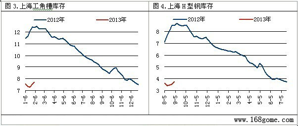2013年2月1日上海市場型材倉庫進行同口徑調(diào)查統(tǒng)計,工角槽庫存7.72萬噸,較上周環(huán)比增加了0.19萬噸,H型鋼庫存3.74萬噸,較上周環(huán)比增加了0.19萬噸。