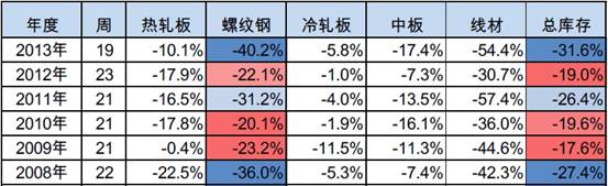 近年7月末鋼材社會(huì)庫(kù)存量較當(dāng)年庫(kù)存高點(diǎn)降幅一覽