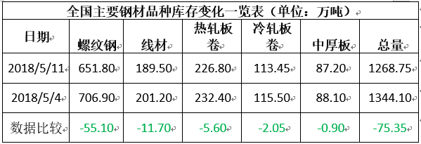 主要鋼材品種中,螺紋鋼庫存量為651.80萬噸,周環(huán)比下降55.10萬噸,減幅為7.79%;線盤總庫存量為189.50萬噸,較上期減少11.70萬噸,減幅為5.82%;熱軋卷板庫存量為226.80萬噸,周環(huán)比下降5.60萬噸,降幅為2.41%;冷軋卷板庫存量為113.45萬噸,周環(huán)比下降2.05萬噸,降幅為1.77%;中厚板庫存量為87.20萬噸,周環(huán)比下降0.90萬噸,降幅為1.02%。本周五大鋼材品種庫存均為下降。不過,當(dāng)前庫存總量較上年同期(1140.40萬噸)高出128.35萬噸,增幅為11.25%。