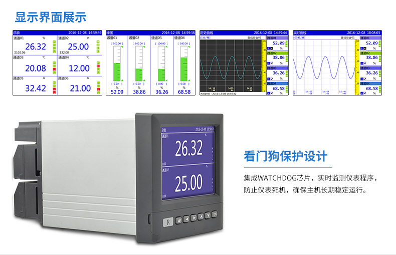 無紙記錄儀是將采集的數(shù)據(jù)/運(yùn)算數(shù)據(jù)以時間為基軸記錄在儀器內(nèi)部的存儲系統(tǒng)中,無消耗任何常用的記錄設(shè)施,如:紙張、筆墨。記錄在儀器內(nèi)部的存儲數(shù)據(jù),通過運(yùn)算、模擬后顯示在液晶屏。常用顯示用液晶屏比較廣泛。在液晶屏屏幕上,可以顯示數(shù)字顯示、棒圖顯示、曲線顯示、報警列表等。無紙記錄儀采集的數(shù)據(jù),常用的有:溫度、壓力、流量、液位、電壓、電流、濕度、頻率、振動、轉(zhuǎn)速等。