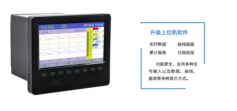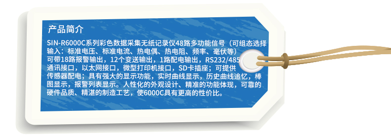 SIN-R6000C系列彩色無紙記錄儀48路萬能輸入(可組態選擇輸入:標準電壓、標準電流、熱電偶、熱電阻、頻率、毫伏等)。可帶18路報警輸出,12個變送輸出,RS232/485通訊接口,以太網接口,微型打印機接口和USB接口,SD卡插座;可提供傳感器配電;具有強大的顯示功能,實時曲線顯示,歷史曲線追憶,棒圖顯示,報警列表顯示。
